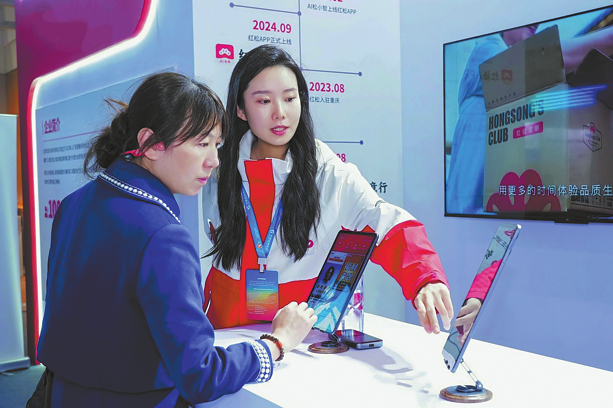 Член на персонала (вдясно) на Beijing Hongsong Online Technology Co Ltd отговаря на запитвания на посетители относно продуктите на компанията по време на индустриално изложение в Пекин през октомври. КИТАЙ ДЕЙЛИ